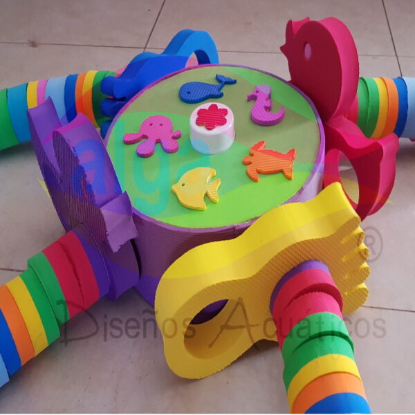 Calesita o pulpo Trae cuatro uniones de flota flota. Cada tentáculo mide 1,20 m. Tiene múltiples usos, por ejemplo se puede armar una flor o pueden ir 4 chicos en el mismo elemento a la vez. ¡Poné a trabajar tu creatividad! No desarmable.