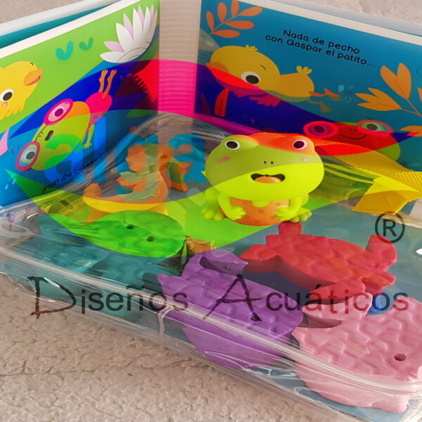 Libro de baño: RANA El librito mide 14 cm x 14 cm y trae: Una rana lanzaagua de personaje principal (7 cm x 5 cm) + valijita contenedora + 5 animalitos marinos en 3 cm de espesor de regalo Los animalitos son: 1 ballena de 7 cm x 4 cm 1 pez de 5 cm…