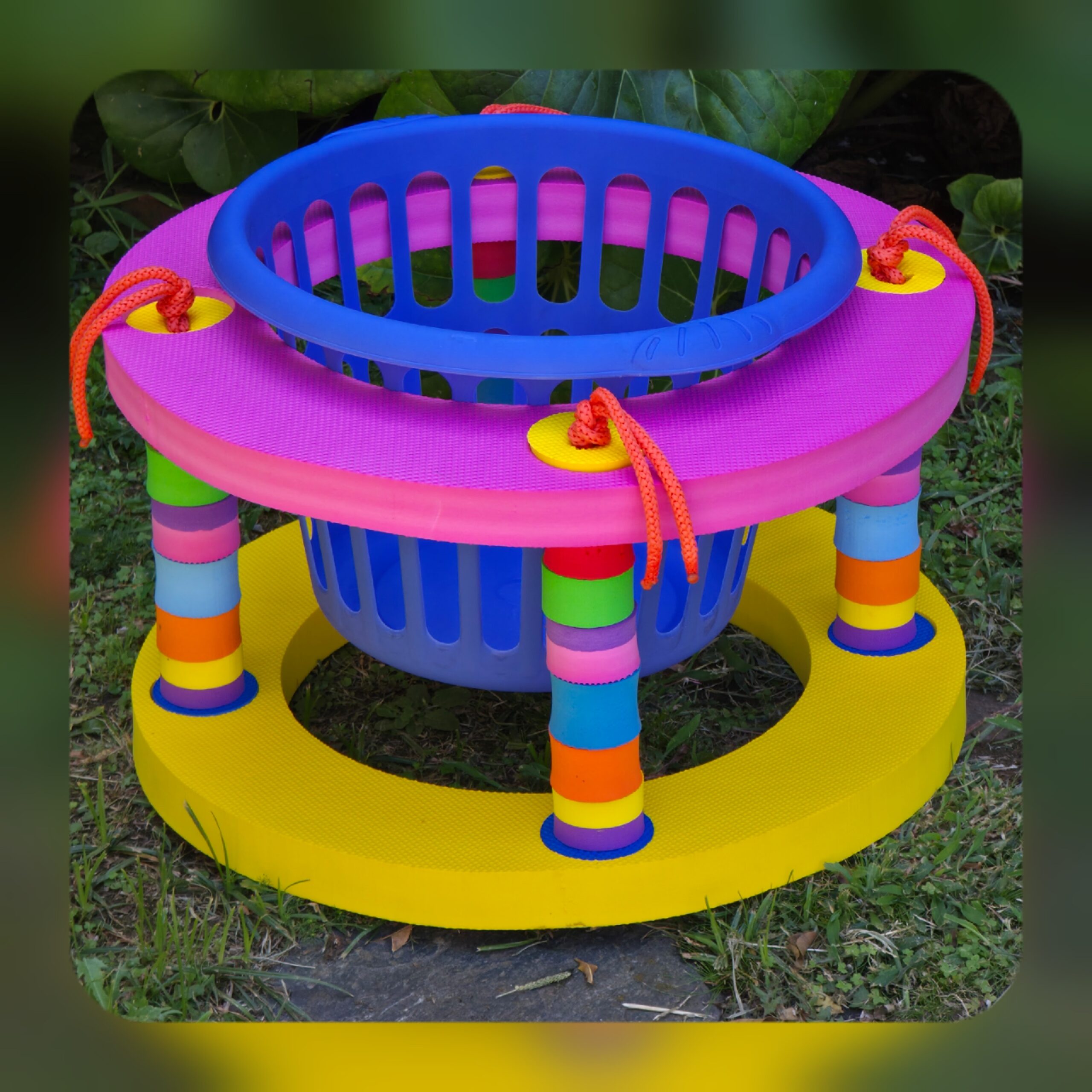 - Este juego consta de dos bases circulares de 50 cm de dianetro, 4 bastones de 30 cm de alto y un canasto.