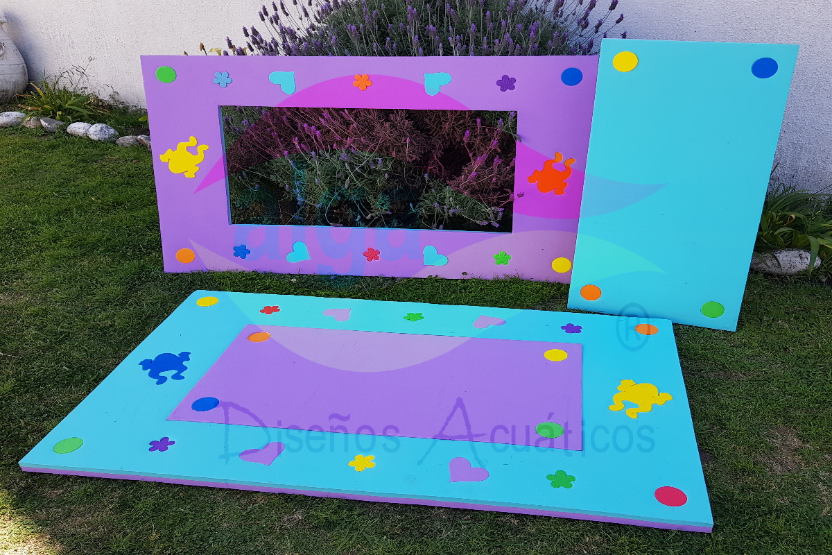 - La colchoneta consta de un marco (1.55 por 0.90 m en 3 cm de espesor) y una parte central (1 m por 0.50 m en 3 cm de espesor).