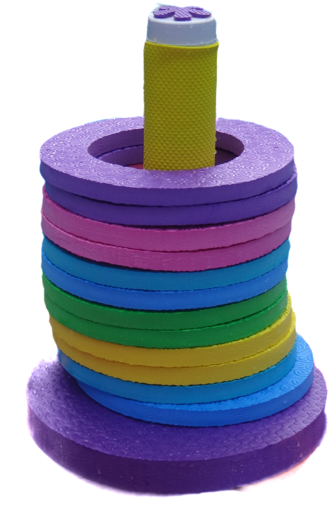 - Una base de 26 cm de diámetro, donde se pueden embocar 12 aros de 21 cm de diámetro. A la vez, cada disco consta de otro central y una estrella encastrable.