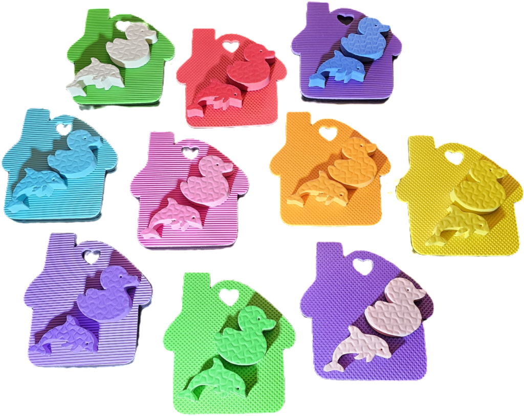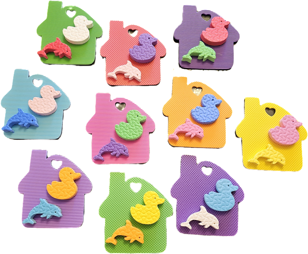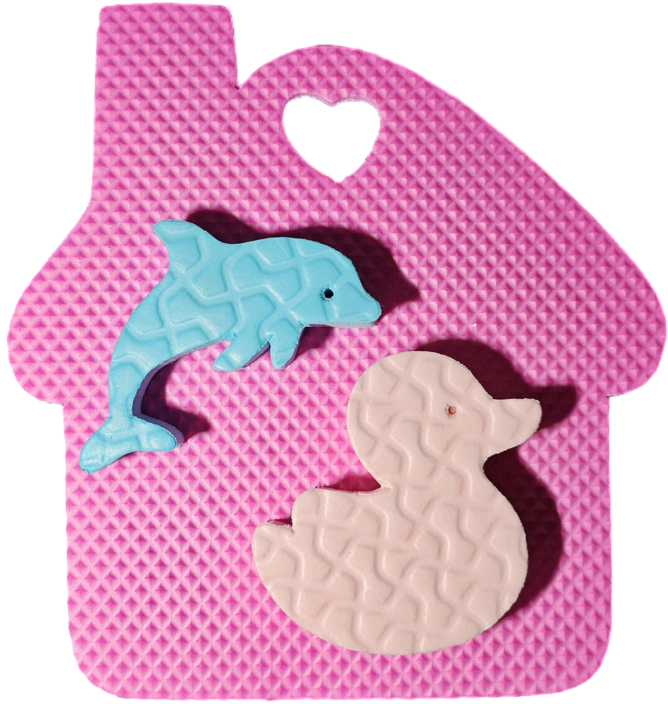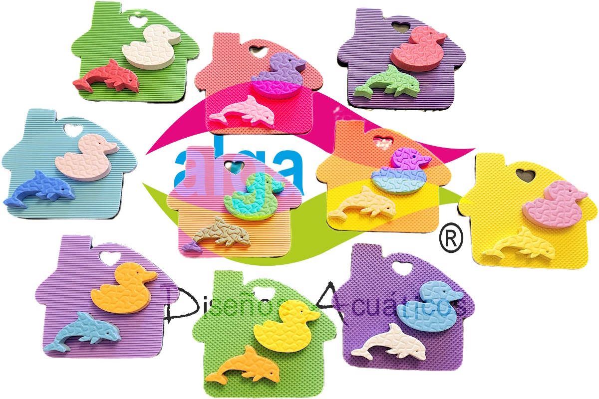 - Cada casita viene con dos animalitos chiquitos en 15 mm de espesor. Estos son patitos de 7 cm de ancho x 7 cm de alto y delfines de 8 cm de ancho x 5 cm de alto.