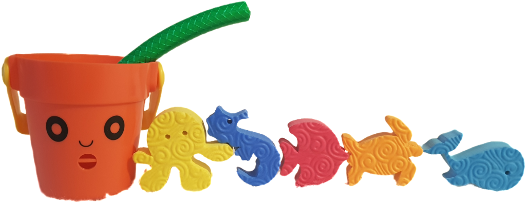 El set incluye un baldecito + manguerita + 5 animalitos marinos diferentes de goma eva en 15 mm
