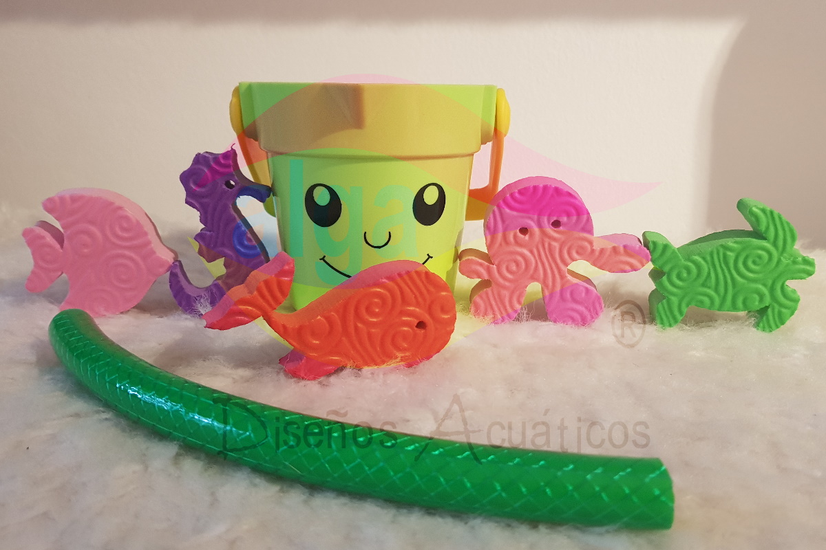Un baldecito + manguerita + 5 animalitos marinos diferentes o iguales en 15 mm